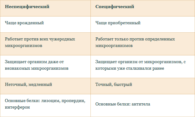 Таб. «Сравнение специфического и неспецифического иммунитета»
